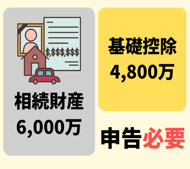 例えば、相続人3名の場合には、 基礎控除額は、3,000万円+(600万円×3名)=4,800円となるので、遺産の額が4,800万円を超える場合に申告が必要となります。